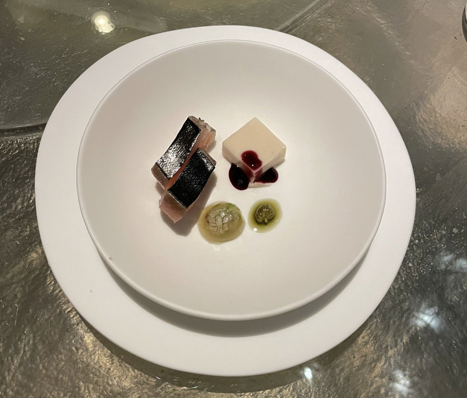 For this dish we have a roll of milk skin rolled on itself with with a Sanfilippo Cantabrian anchovy. We finish with a kizami (Japanese for “chopped”) of parsley and ginger stems.