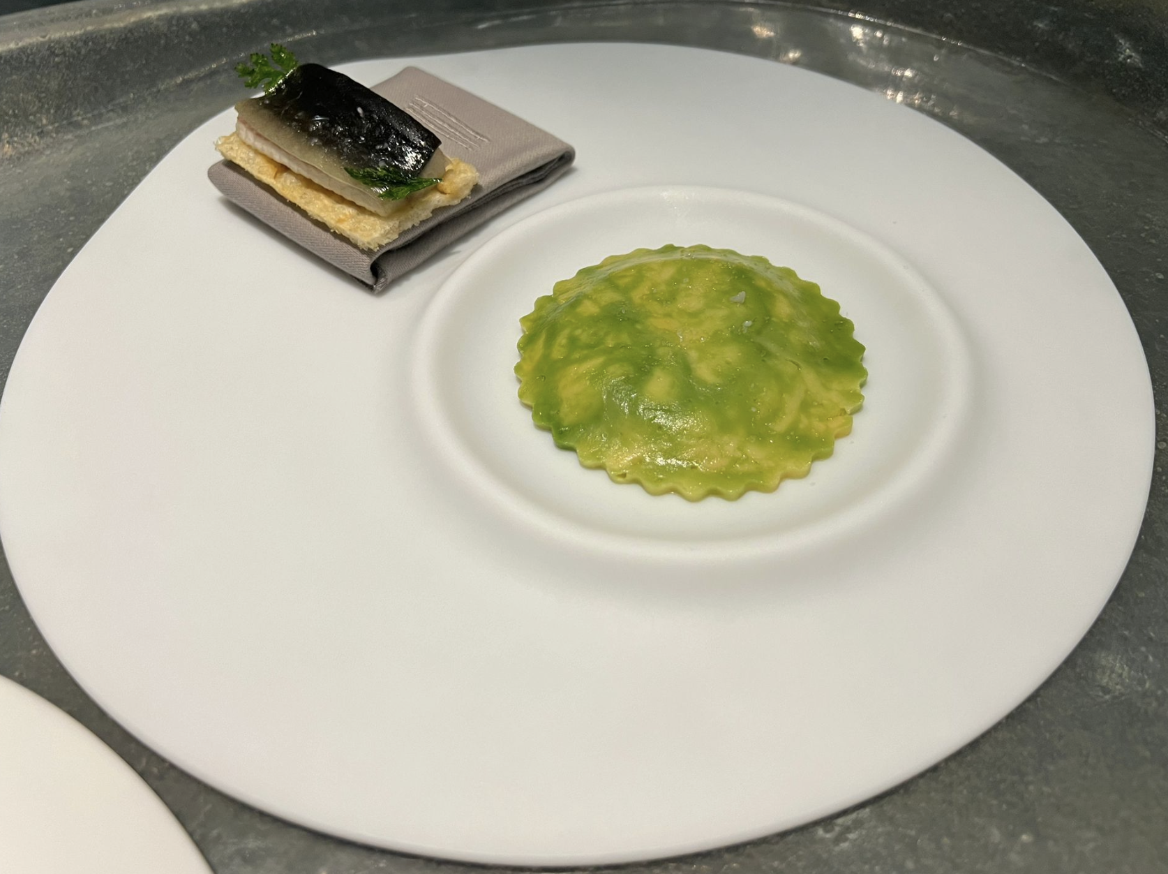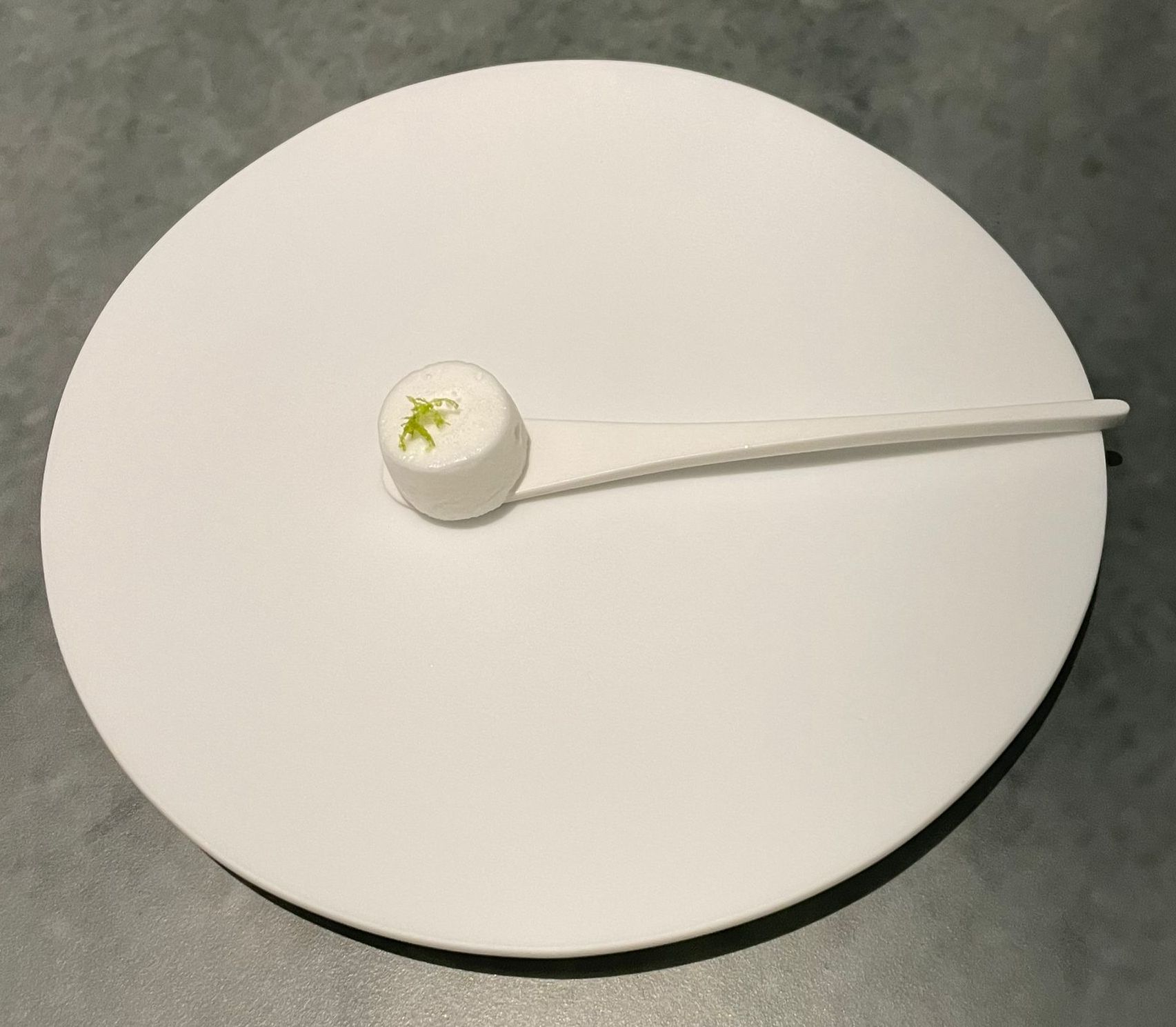 For this dish we have a roll of milk skin rolled on itself with with a Sanfilippo Cantabrian anchovy. We finish with a kizami (Japanese for “chopped”) of parsley and ginger stems.