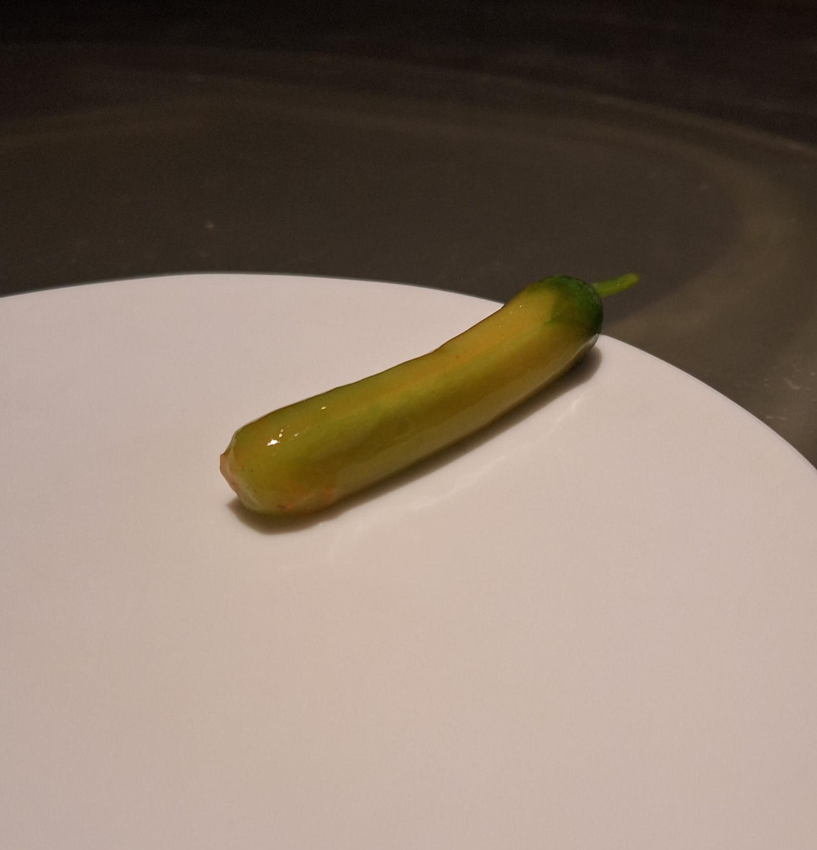Mini pepino ligeramente encurtido bañado en gelatina de aguachile de achiote, acabado con ralladura de lima.