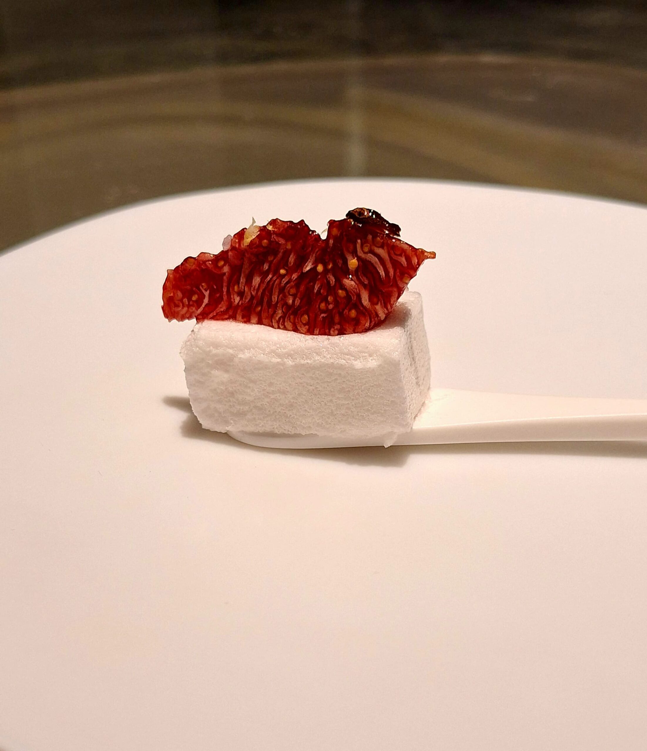We have altered the recipe of a meringue that we bake so that the honey caramelizes and its texture becomes very peculiar, so much so that it doesn’t remind of a meringue. Geometric cutter cut, crowned with peach sorbet, 2 bites.