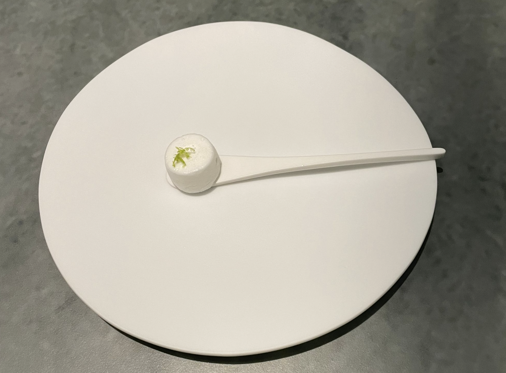 For this dish we have a roll of milk skin rolled on itself with with a Sanfilippo Cantabrian anchovy. We finish with a kizami (Japanese for “chopped”) of parsley and ginger stems.