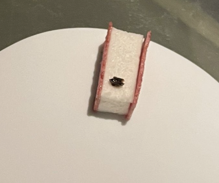 Hemos alterado la receta de un merengue que horneamos para que la miel caramelice y su textura resulte muy peculiar, tanto como no parecer un merengue. Corte geométrico al cutter, corona un sorbete de melocotón,  2 bocados.