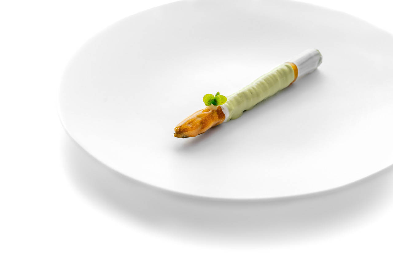 For this dish we paint a roll of milk skin rolled on itself with matured cow fat and serve it with a Cantabrian anchovy. We finish with a kizami (Japanese for “chopped”) of parsley and ginger stems.