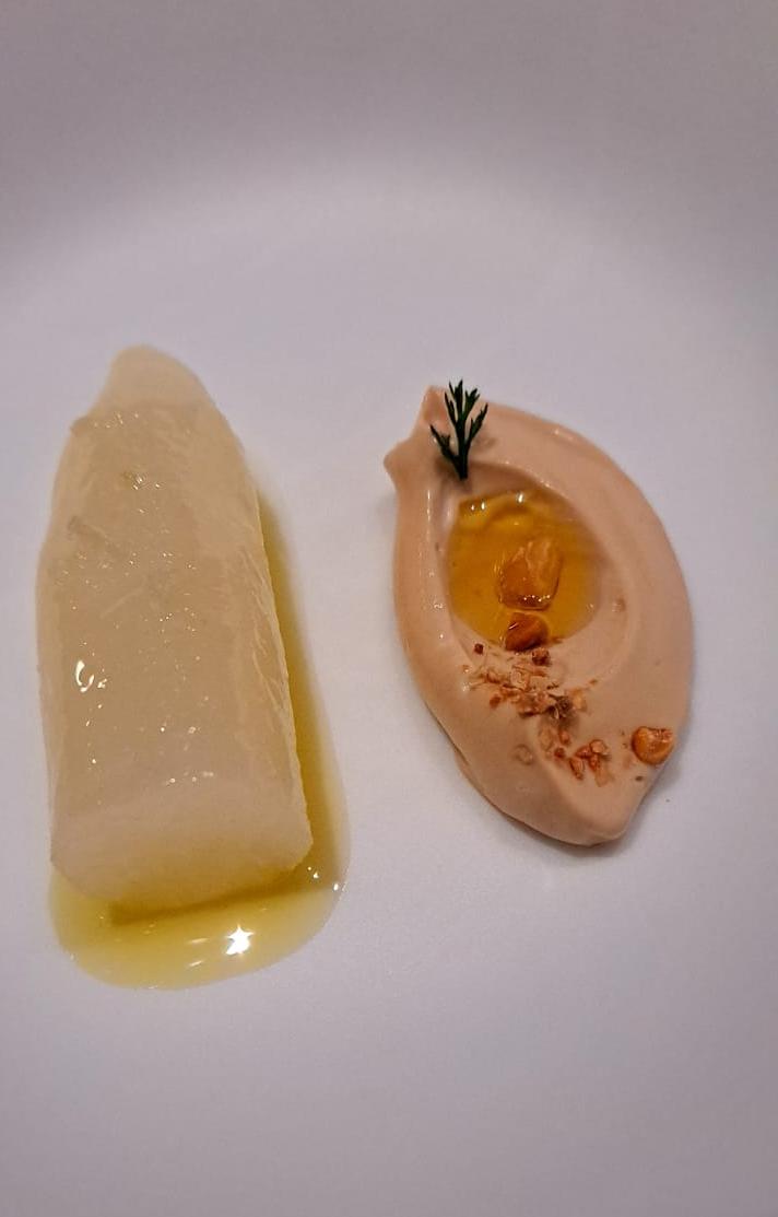 Espárrago blanco de Tudela (Navarra) que cocinamos al vacío con sal. Una vez obtenemos el punto de cocción perfecto, enfriamos y realizamos cortes muy precisos para crear la forma de “pluma”.
