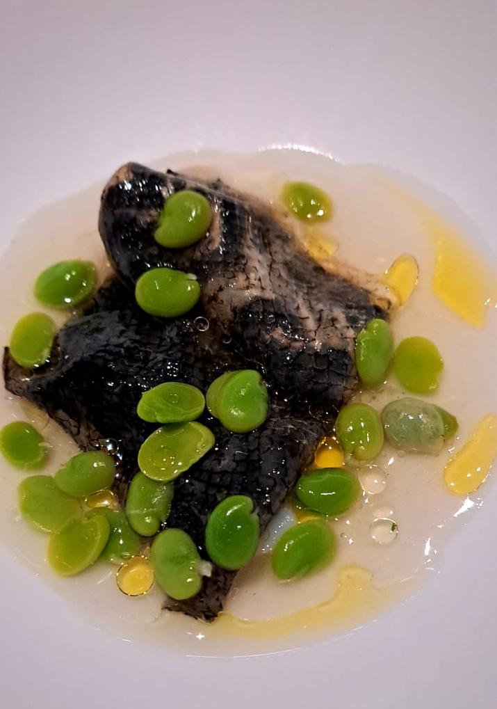Piel de bacalao y nori, habitas, bacalao confitado y caldo de jamón ibérico.