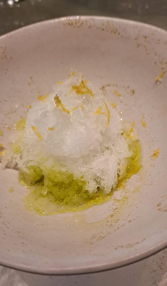 Leche de almendra cruda y zumo de limón gelificado dentro de su propia piel y terminado con un poco de ralladura de limón.